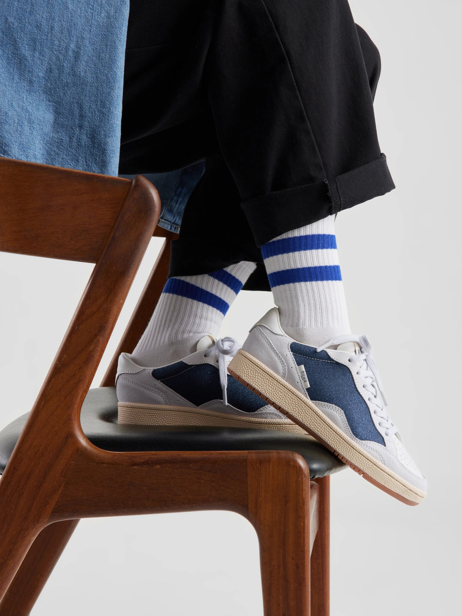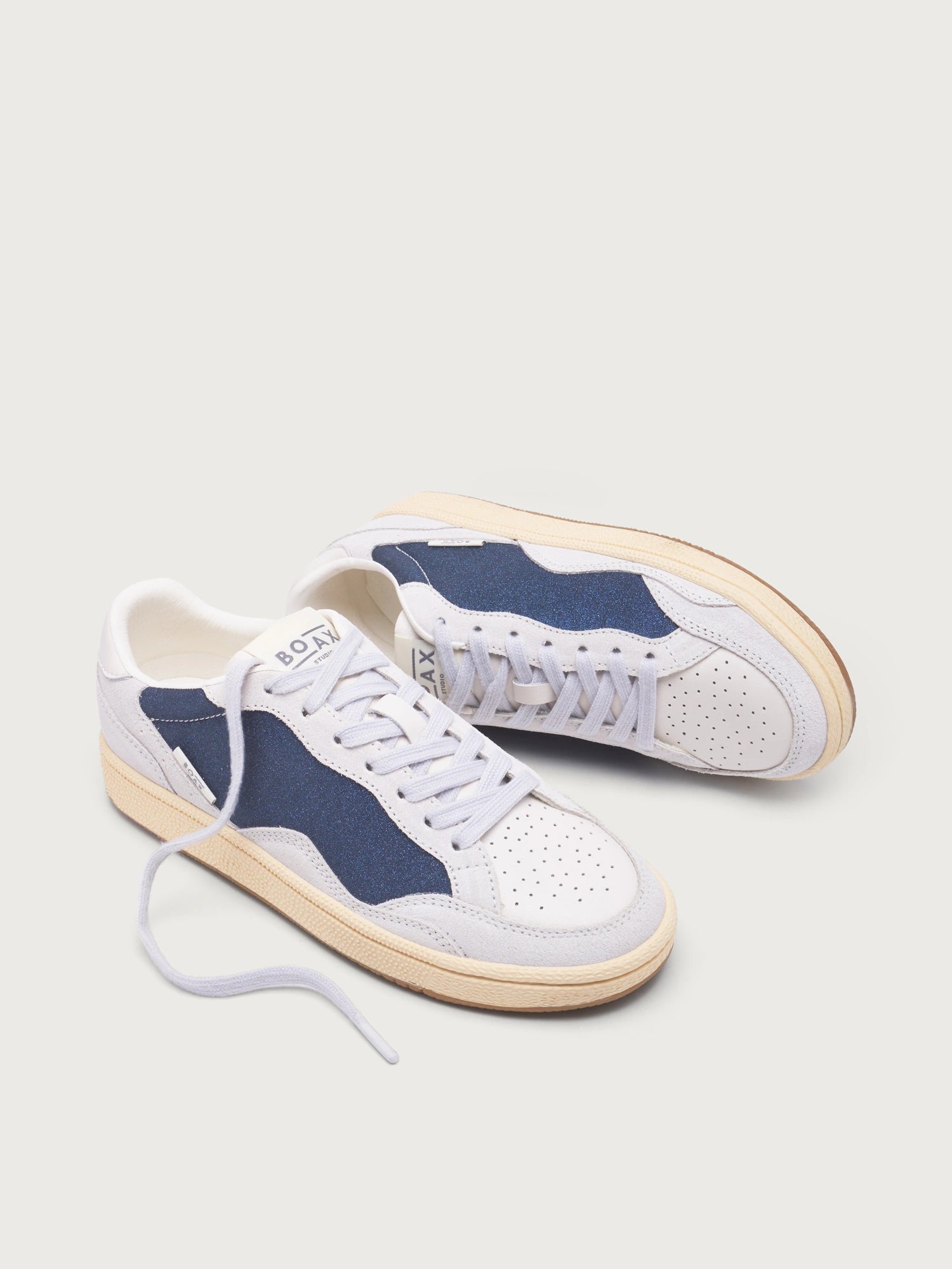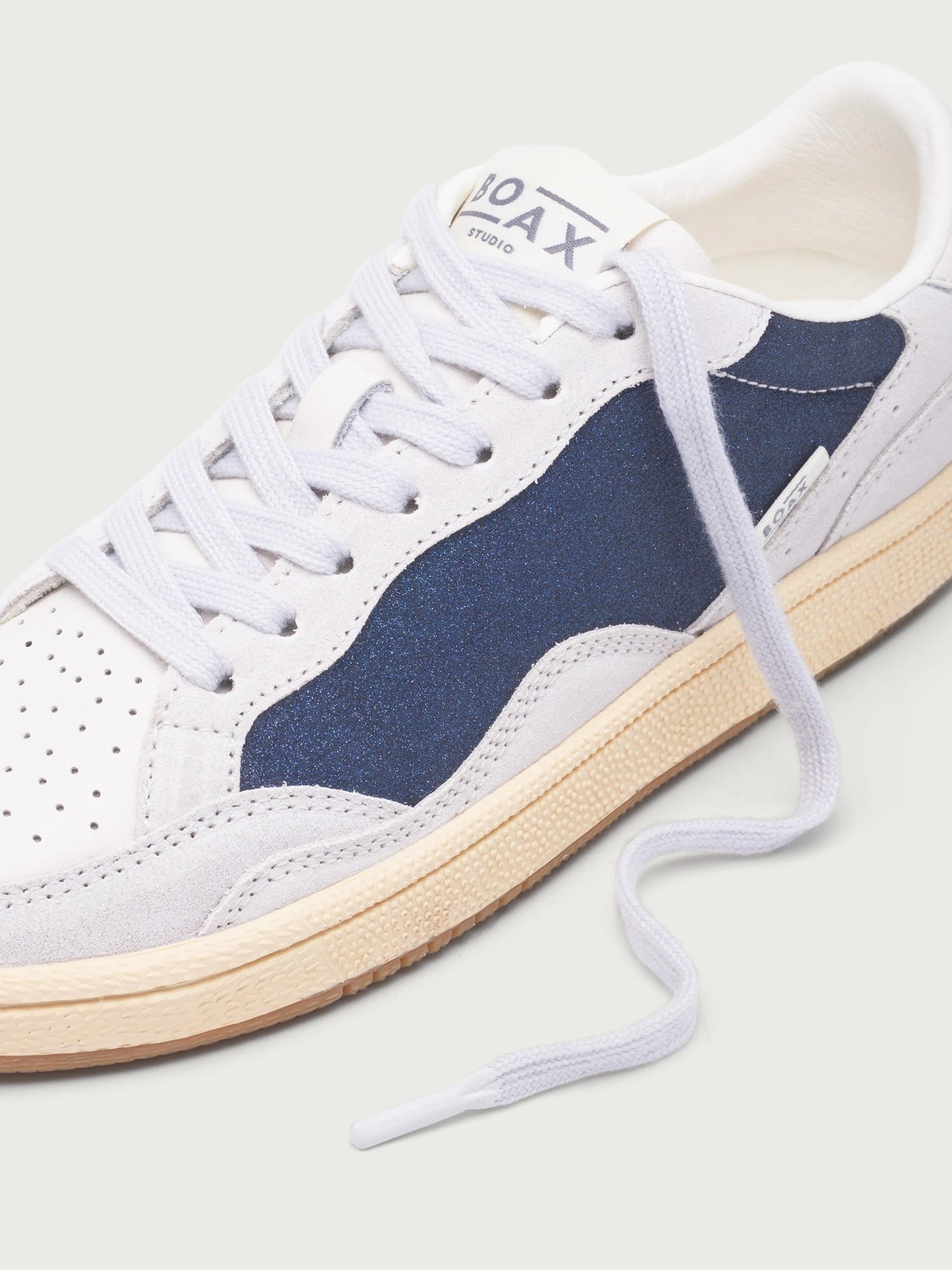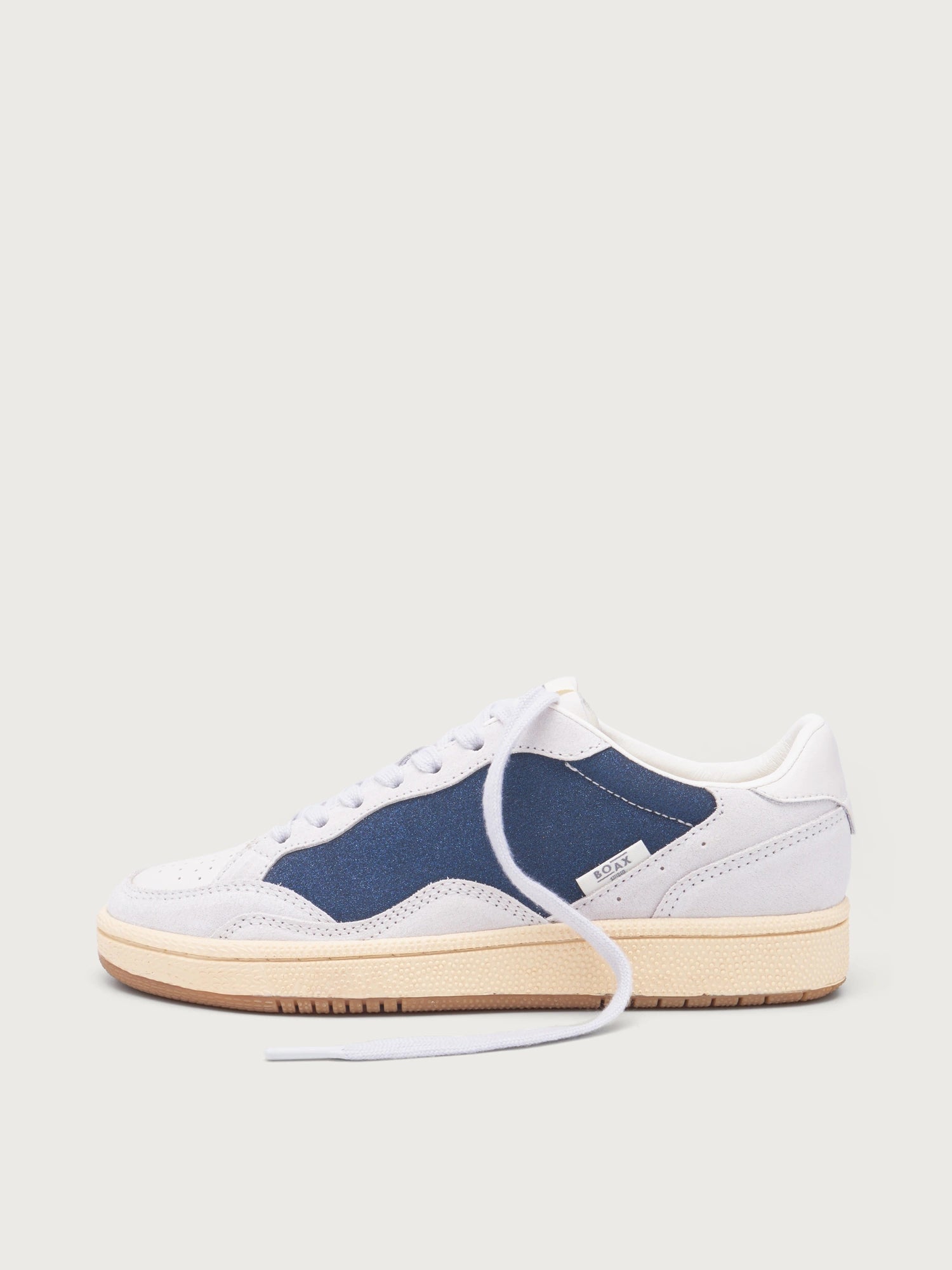 This sneaker combines sleek navy glitter with soft grey suede for a modern, understated look. The dark glitter panel adds a touch of sophistication, making these shoes a versatile option for both casual and slightly dressed-up outfits. The lightweight rubber sole ensures all-day comfort while maintaining a stylish appearance.