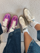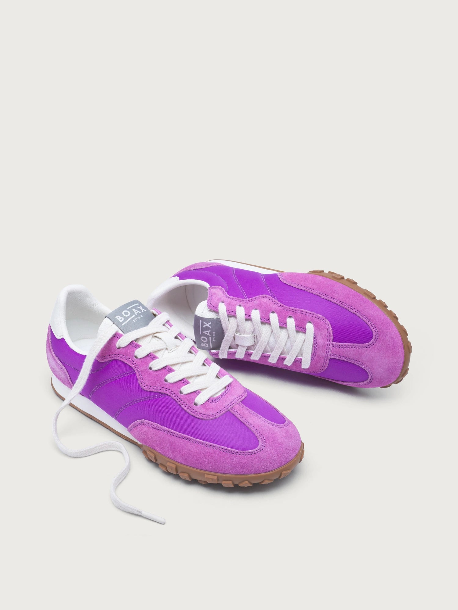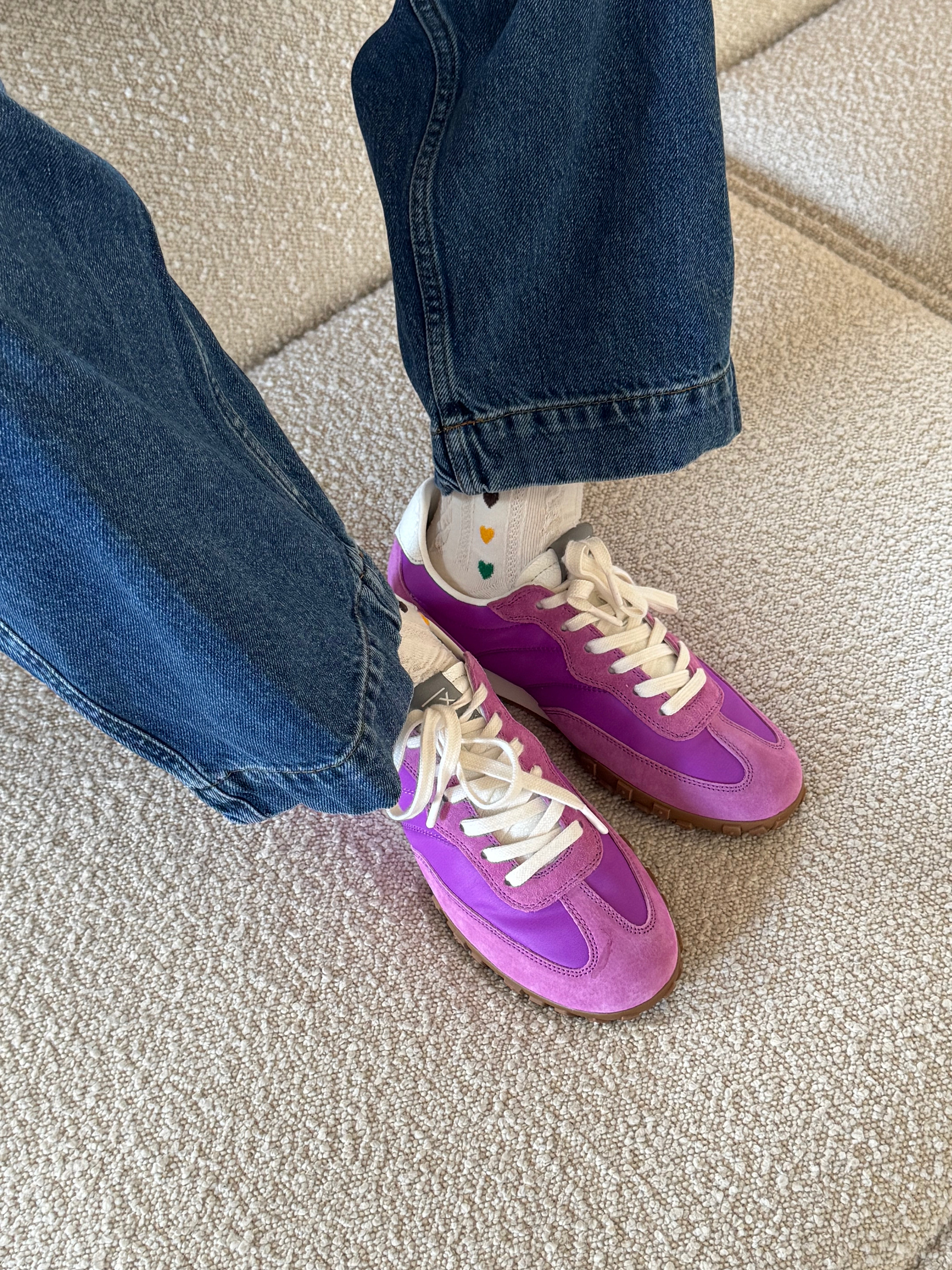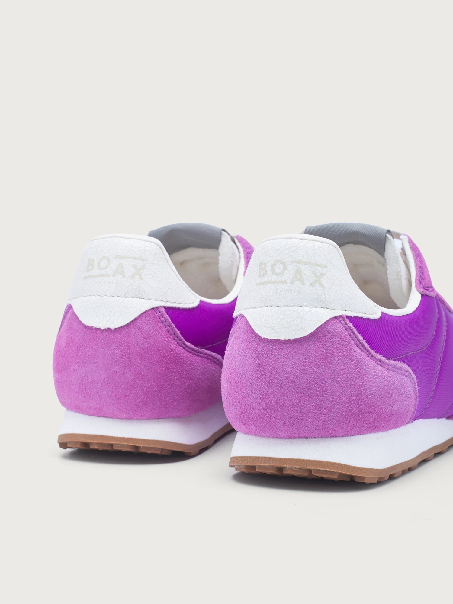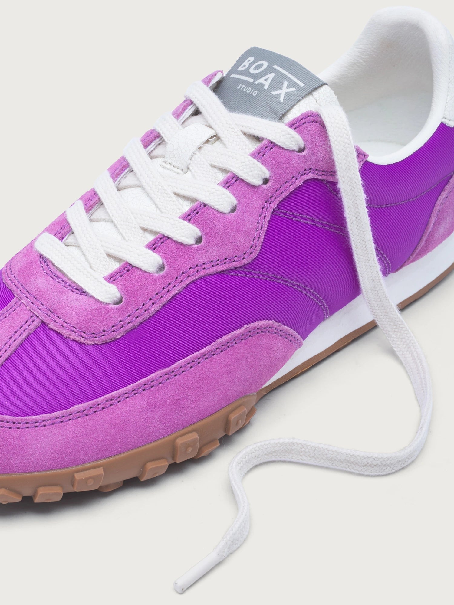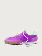 This sneaker makes a bold statement with its vibrant purple upper and contrasting yellow sole. The sporty design, featuring a mix of nylon and suede materials, combines retro-inspired style with modern comfort. The textured sole ensures extra grip and durability, making these sneakers perfect for active days or casual outings.