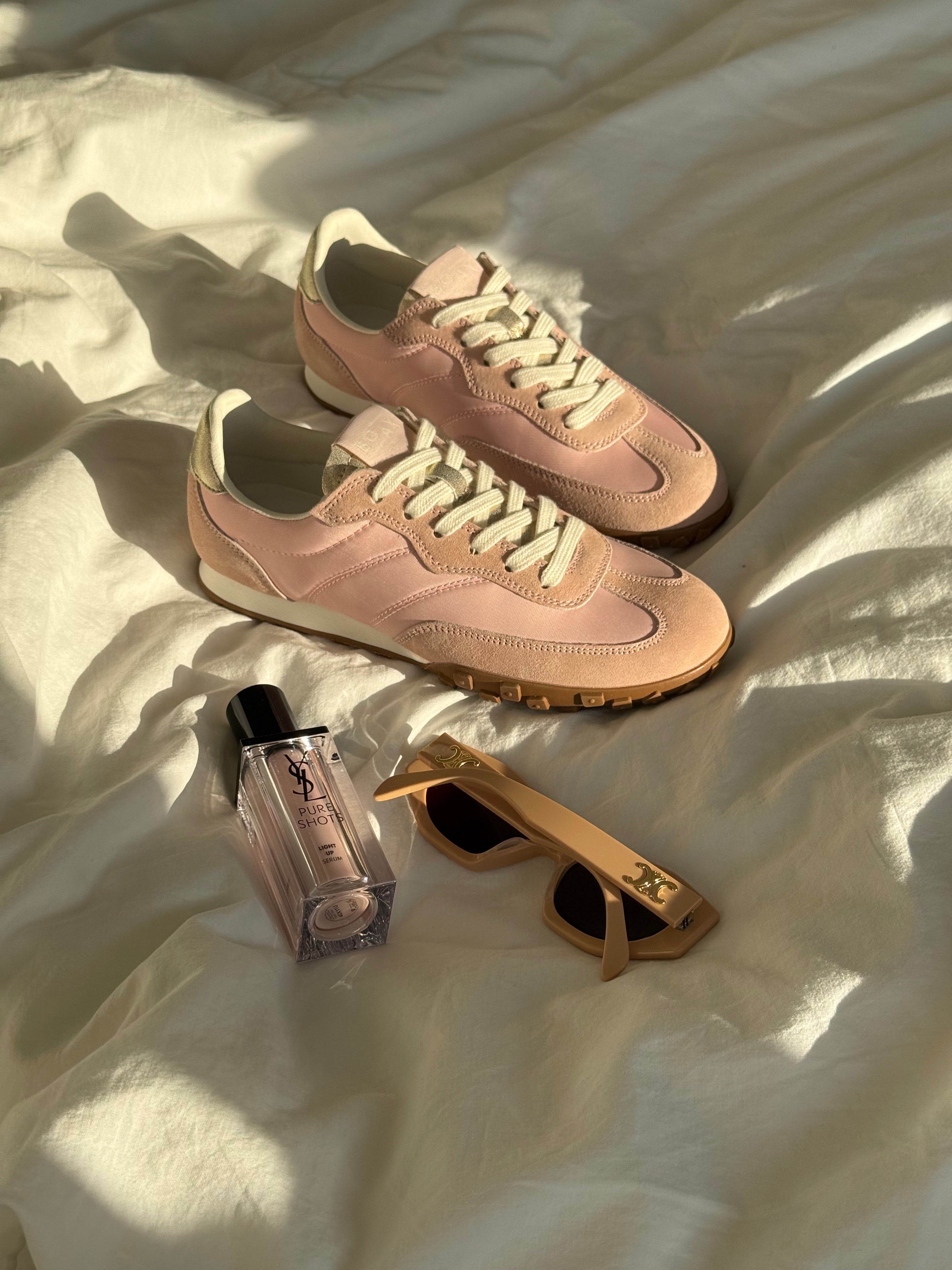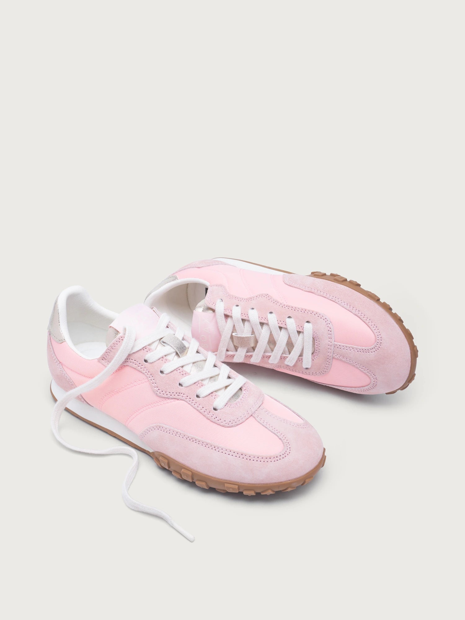 This women’s sneaker offers a soft, feminine look with its pastel pink upper and contrasting yellow sole. The combination of suede and nylon materials adds texture and depth, while the caramel sole adds a playful, sporty touch. The lightweight, textured sole ensures extra grip and comfort, perfect for active days or casual outings.